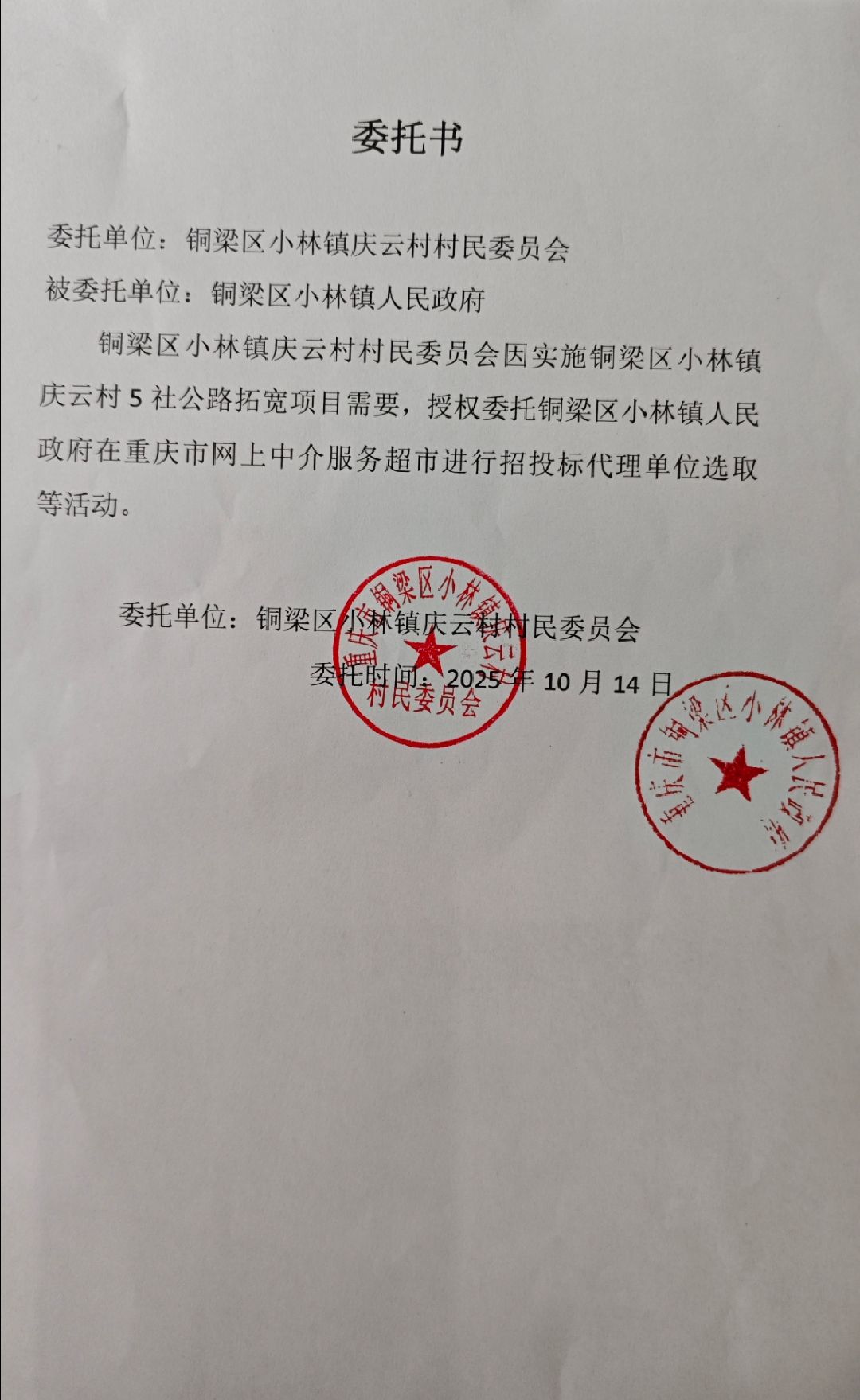 关于为【铜梁区小林镇庆云村5社公路拓宽项目】 公开选取【工程造价咨询】机构的公告