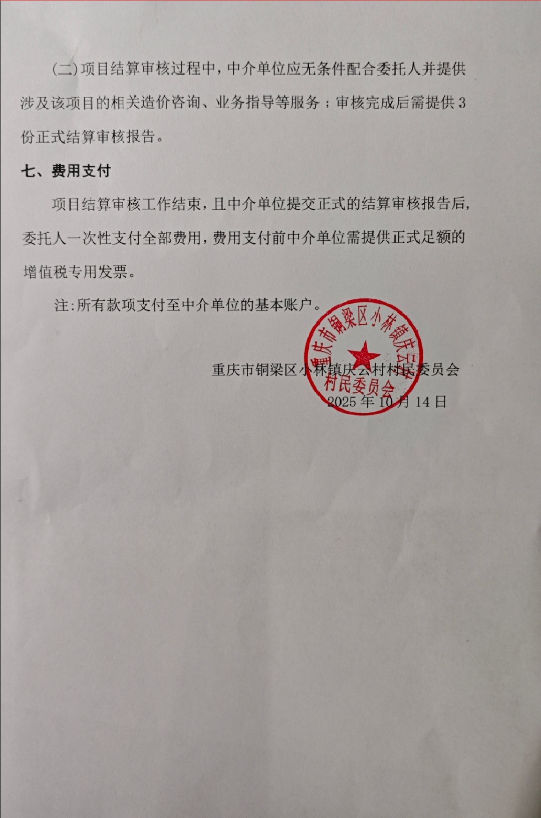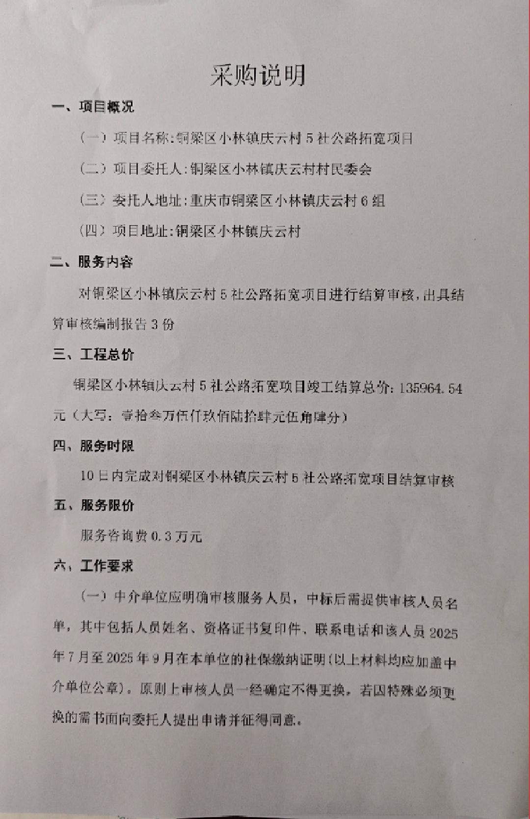 服务内容对铜梁区小林镇庆云村5社公路拓宽项目进行结算审核,出具结算审核编制报告3份